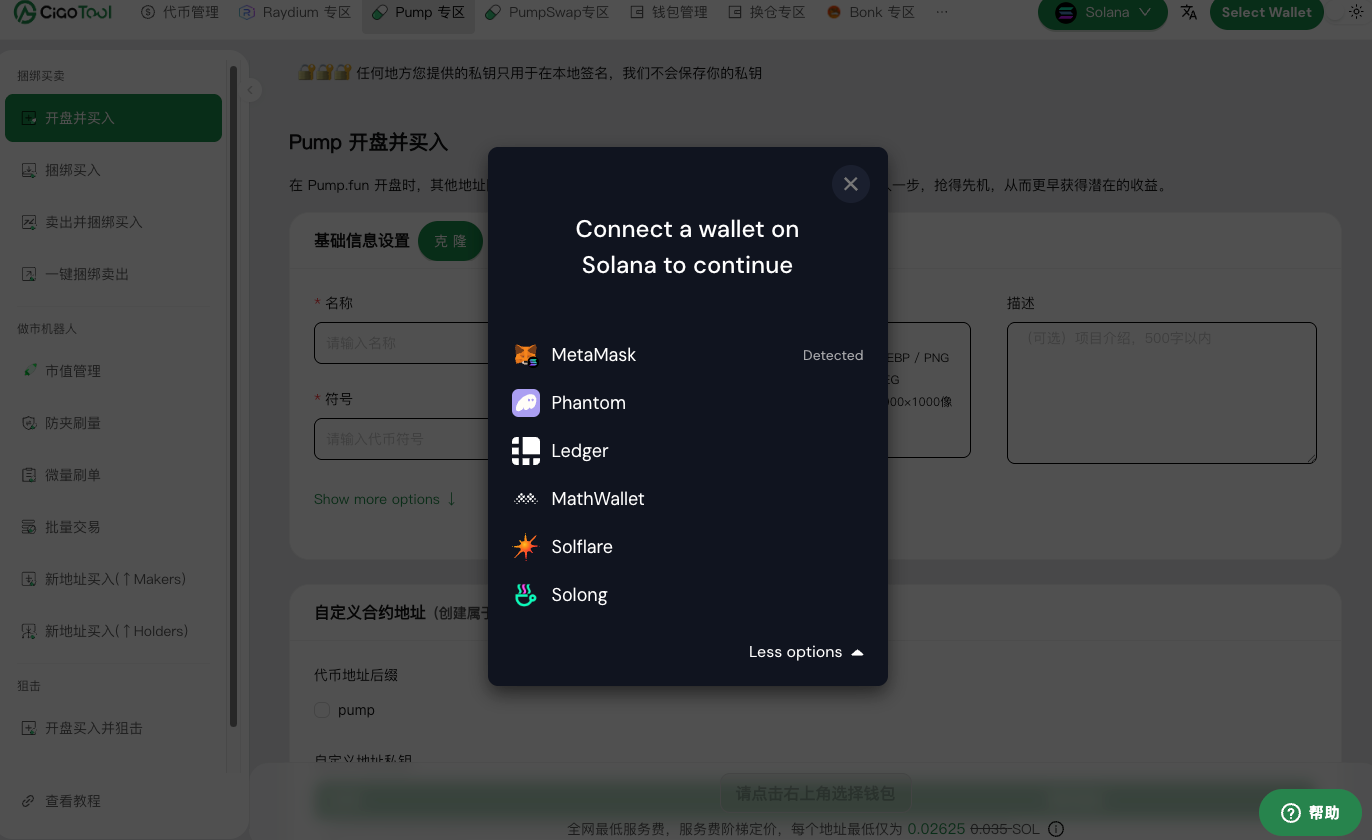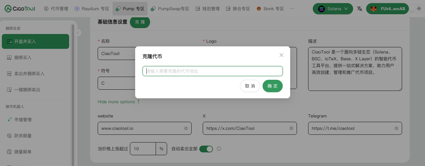 **Pump 开盘并买入**：<https://ciaotool.io/zh-CN/pump/launch-and-buy>