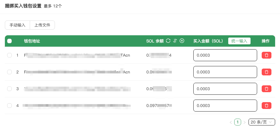 * 设置买入金额：手动输入数量，统一输入金额/百分比/全部，（全部即导入钱包能购买的最大数量）。