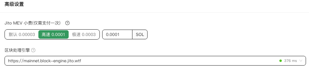 * 配置 Jito MEV 小费，用于加速打包交易，提高排序优先级。