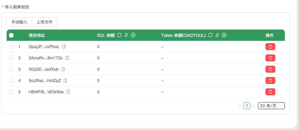 * 批量导入钱包（支持文件类型:Excel/CSV/TXT/JSON），或者手动输入粘贴私钥。