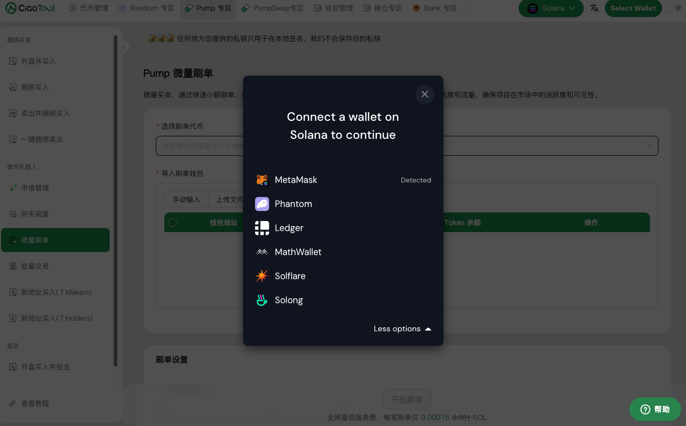 **Pump 微量刷单：**<https://ciaotool.io/zh-CN/pump/micro-trading>