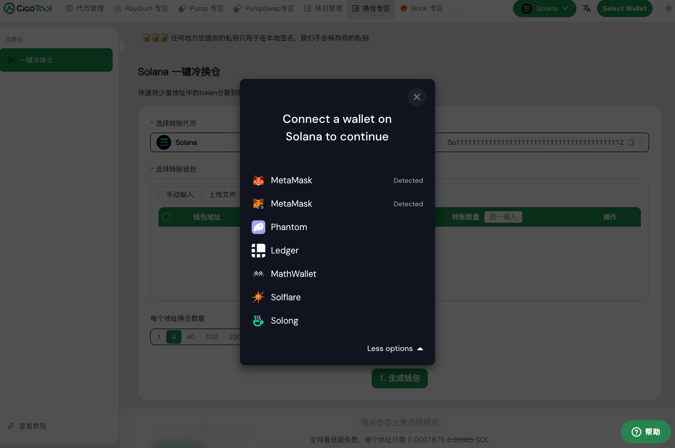 **Solana 一键冷换仓**：<https://ciaotool.io/zh-CN/changeWarehouseZone/one-click-coldChangeWarehouse>