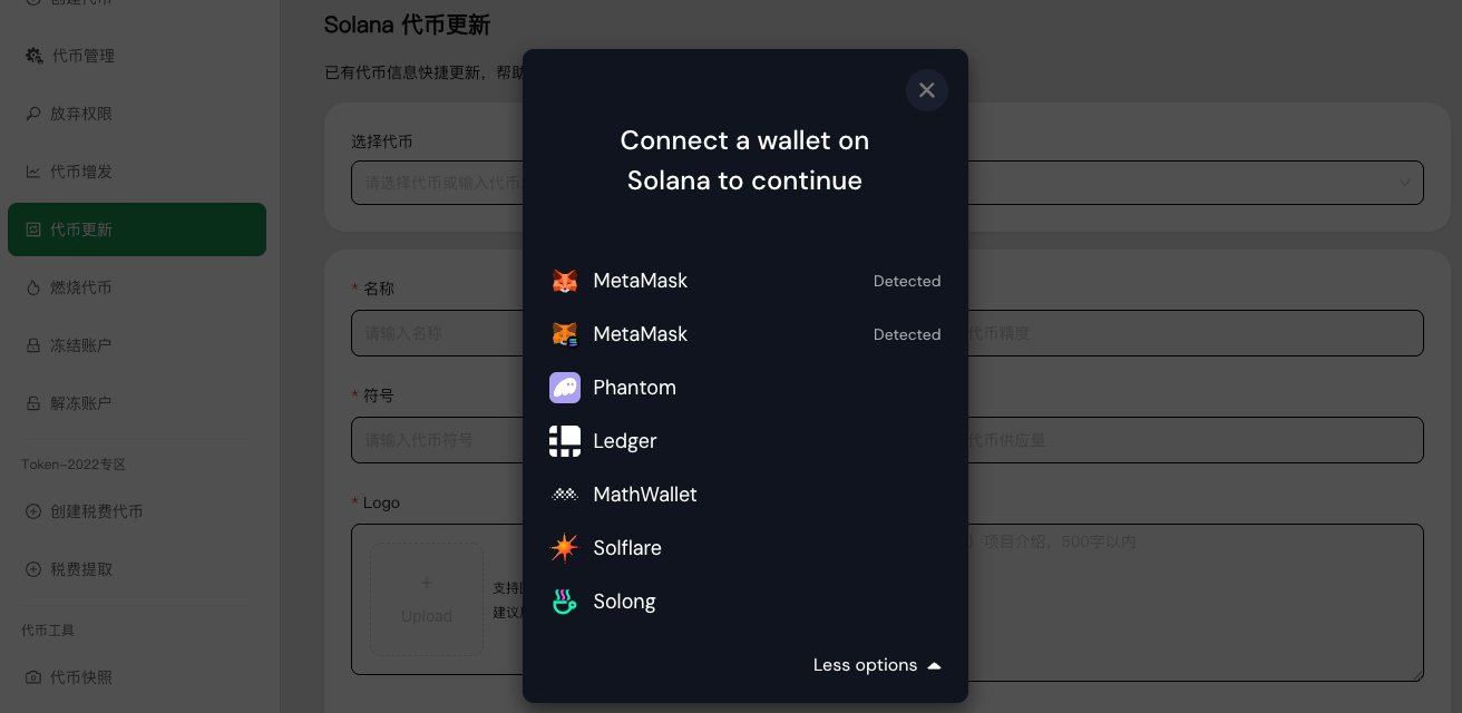 Solana 代币更新，是指对已发行 Token 的链上元数据（Metadata）进行修改，如名称、Logo、描述、官网链接等。该操作依赖 **Metadata Update Authority（元数据修改权限）**，只有持有该权限的钱包才能进行更新。一旦放弃该权限，代币信息将永久不可更改。