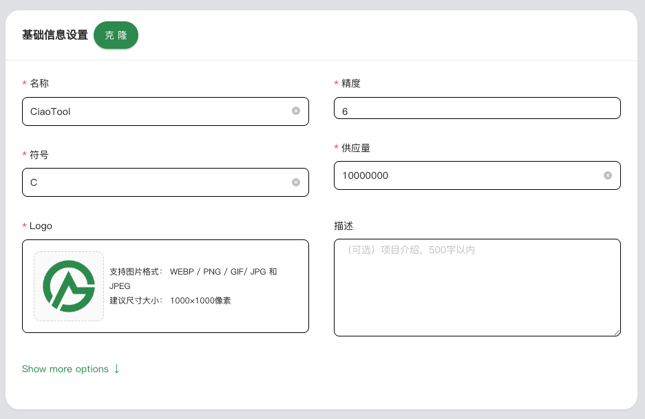 * **上传图片：**&#x4E0A;传 Token 图标，建议 1000×1000 像素，支持 WEBP / PNG / GIF/ JPG 和 JPEG