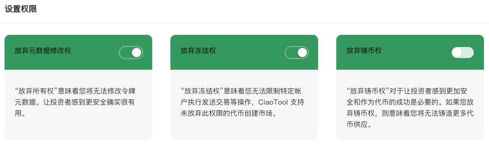 * 元数据修改权限可以自行选择，如果放弃元数据权限，那么代币名称和logo将不能更新。