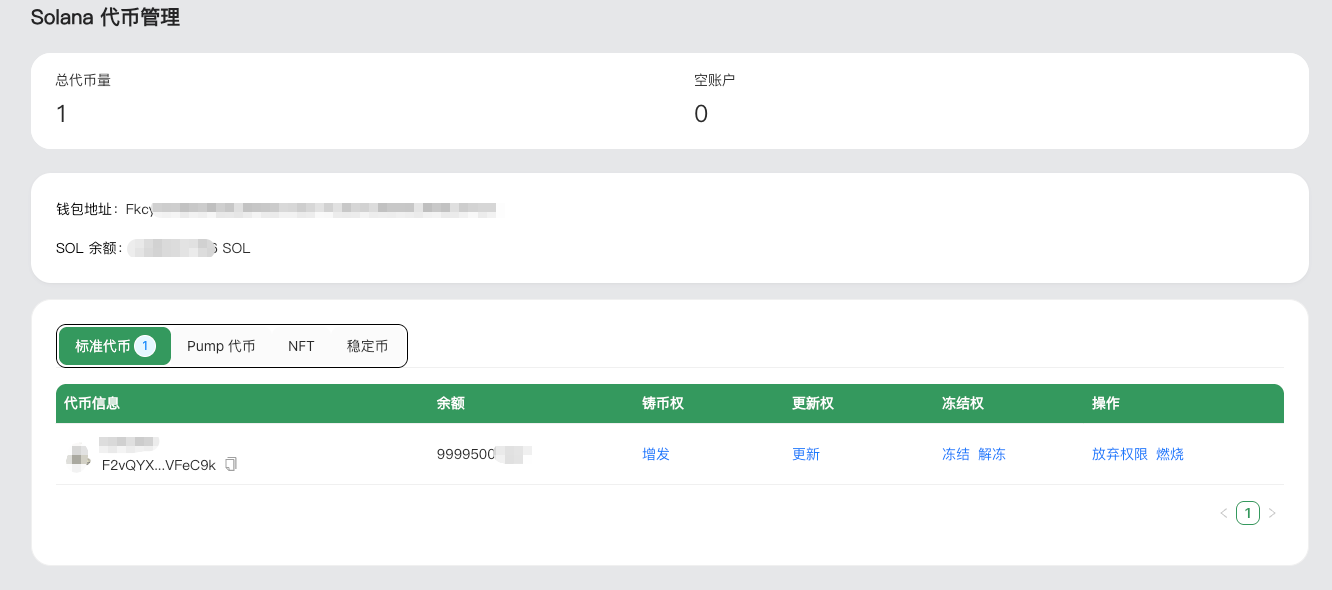 Solana 代币管理，是指对已创建的 Token 进行统一操作与控制，包括权限管理、批量操作等。通过工具可对不同类型代币（标准代币、Pump 代币、NFT、稳定币）进行一站式管理，无需编程即可完成复杂操作，提升资金与策略执行效率。